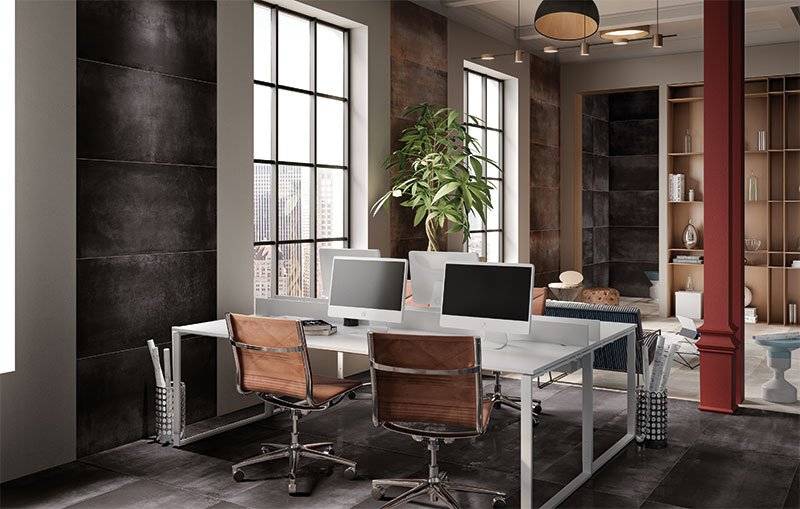 Ce grès cérame est disponible à la vente en 4 tons métallisés avec des nuances de noir au gris en passant par un marron oxydé. Il existe en de multiples formats rectifiés pour les murs et les sols :