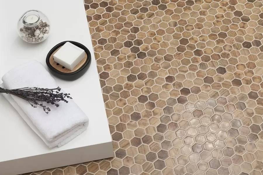 Expérience Carrelage vous présente une mosaïque de salle de bain imitation bois, la collection Woods de Vidrepur.