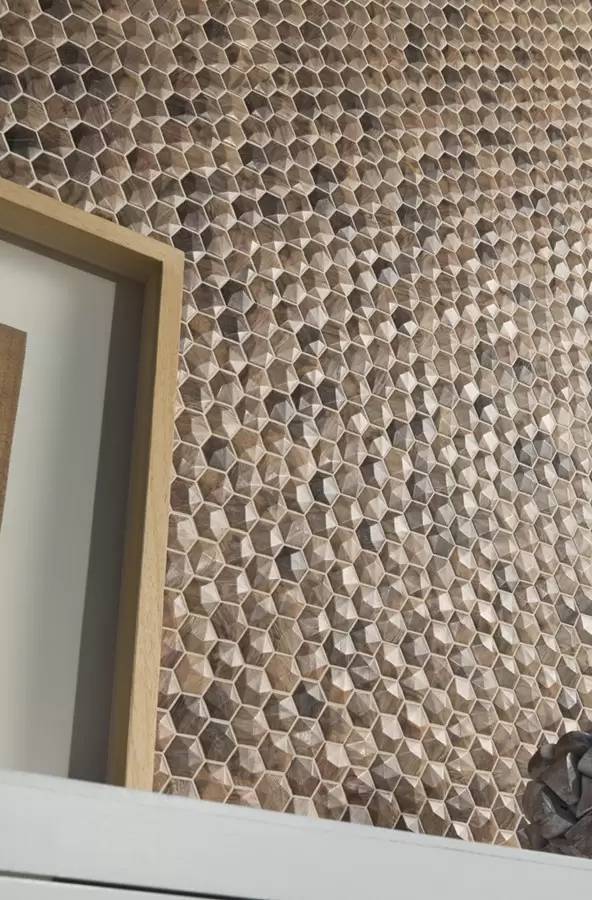 Cette plaque de mosaïque imitation bois est composée de petits carreaux plats de 25x25mm ou en relief. Elle existe aussi à la vente en format hexagonal.